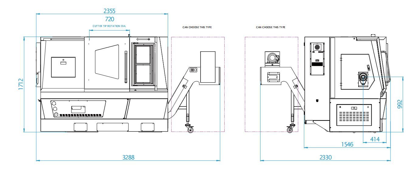 Machine Size(L×W×H)mm3290×1540×1710 (Right Side chip removal)/2355×2355×1710 (Rear chip removal)